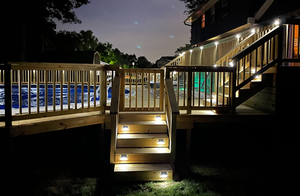 Stainless steel step lights were embedded into the wooden stair treads and fence posts around the pool area. The cool-toned illumination clearly lights the steps to ensure nighttime safety while also adding dotted highlights that enhance the natural texture of the wood.